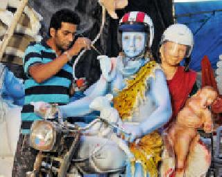 लोकमान्य टिळकांनी सार्वजनिक गणेशोत्सवाची कल्पना मांडली तीच मुळात जनजागृतीच्या उद्देशाने. आता गणेशोत्सवाचे स्वरूप बदलले असले तरी जनजागृतीचा वसा मात्र कलावंतांनी सोडलेला नाही. शासकीय चित्रकला महाविद्यालयाच्या विद्यार्थ्यांनी आपल्या कल्पकतेतून ही मूर्ती साकारली असून सुरक्षित वाहतुकीचा संदेश ते यातून देत आहेत. नागपुरातील फे्रंडस् फॉरएव्हर या मंडळासाठी बनविण्यात आलेली ही मूर्ती दुचाकीवर स्वार असून विसजर्नानंतर जलप्रदूषण होऊ नये म्हणून ही दुचाकी पाण्यातून परत काढली जाणार आहे. ही मूर्ती व या विषयावरील एकूणच देखावा साकारण्यासाठी लाखाच्यावर खर्च आला आहे, असे मूर्तिकार राकेश पाठराबे यांनी सांगितले.