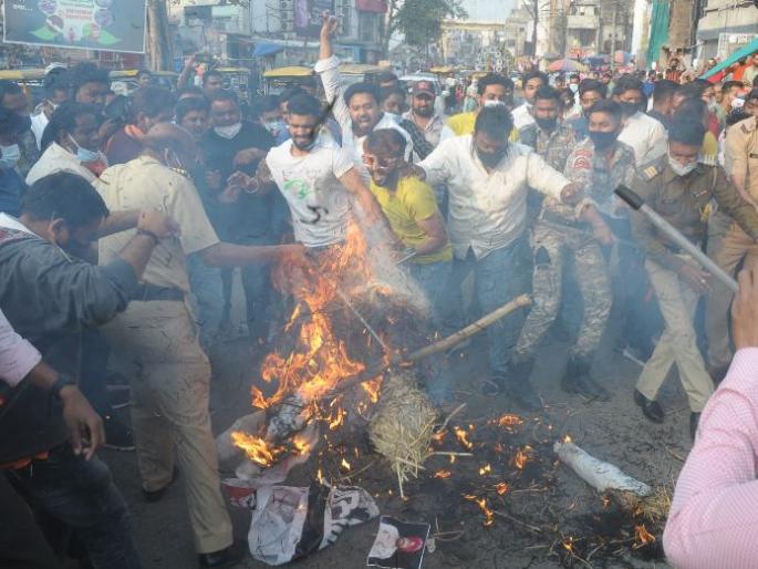 नागपूर : पंजाबमध्ये पंतप्रधान नरेंद्र मोदी यांच्या दौऱ्यादरम्यान सुरक्षाव्यवस्थेतील त्रुटींवर देशभरातील राजकारण तापले आहे. याच घटनेचे पडसाद नागपुरातही उमटले. राष्ट्रीय स्वयंसेवक संघाच्या मुख्यालयापासून दोनशे मीटर अंतरावर असलेल्या बडकस चौकात भारतीय जनता युवा मोर्चातर्फे आंदोलन करण्यात आले. यावेळी पंजाबचे मुख्यमंत्री चरणजितसिंह छन्नी यांचा पुतळा जाळण्यात आला. परंतु या आंदोलनामुळे विरोधकांच्या प्रतिमेला जाळ लागण्याऐवजी चक्क बंदोबस्तावर असलेल्या पोलीस कर्मचाऱ्यालाच चटके बसले अन् आंदोलन आपल्या राज्यातील पोलिसांनाच जायबंदी करण्यासाठी होते की काय, अशी चर्चा उपस्थितांमध्ये सुरू झाली.