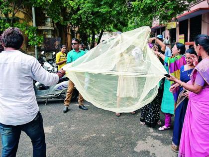 महापालिका स्मार्ट सिटी प्रकल्प राबवित असतानाच रेशीमबागसह शहरात ठिकठिकाणी पावसाचे पाणी साचले आहे. यामुळे शहर डासांच्या विळख्यात आहे. परंतु महापालिका प्रशासनाकडून उपाययोजना केल्या जात नाही. घाणीमुळे विविध आजार वाढले आहेत. याकडे महापालिका प्रशासन व पदाधिकाºयांचे लक्ष वेधण्यासाठी काँग्रेसच्या नगरसेवकांनी सभागृहात मच्छरदाणी घेऊन नारेबाजी केली. तसेच मच्छरदाणी महापौरांना भेट दिली. सभागृहाबाहेरही आंदोलन केले. डास वाढल्यानंतरही महापालिकेच्या मलेरिया व फायलेरिया विभागाचे याकडे दुर्लक्ष असल्याने नागरिक त्रस्त आहेत. याकडे लक्ष वेधण्यासाठी काँग्रेसच्या नगरसेवकांनी नारेबाजी केली. विरोधी पक्षनेते तानाजी वनवे, बंटी शेळके, नगरसेवक दुनेश्वर पेठे, संदीप सहारे, नगरसेवक पुरुषोत्तम हजारे, नगरसेवक हरीश ग्वालबंशी, हर्षला साबळे, जुल्फिकार भुट्टो,किशोर जिचकार, रमेश पुणेकर, परसराम मानवतकर, दिनेश यादव, स्नेहा विवेक निकोसे, आयशा उईके, जीशान मुमताज, सैयदा बेगम निजाम अंसारी, प्रणीता शहाणे, दर्शनी धवड, रश्मी धुर्वे, कमलेश चौधरी, नेहा राकेश निकोसे, नितीन साठवणे, उज्ज्वला बनकर, भावना लोणारे, साक्षी राऊ त आदींचा सहभाग होता. तसेच सभागृहाबाहेर युवक काँग्रेसचे कार्यकर्ते बहुसंख्येने उपस्थित होते.