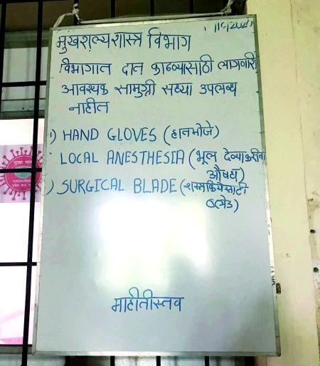 नागपूर : शासकीय रुग्णालयांना औषधे व इतर साहित्य उपलब्ध करून देण्याची जबाबदारी हाफकिन कंपनीची आहे. परंतु २०१७-१८ पासून कंपनीकडून औषधीच मिळाल्या नाहीत. यातच अधिष्ठात्यांकडून स्थानिक खरेदीचे अधिकार काढून घेतल्याने शासकीय दंत महाविद्यालय व रुग्णालय (डेंटल)अडचणीत आले आहे. भूल देण्याच्या औषधांपासून ते हॅण्डग्लोव्हज, सर्जिकल ब्लेडचा तुटवडा आहे. परिणामी, रुग्णांना विना उपचार परत जावे लागत आहे. धक्कादायक म्हणजे, मुख शल्यक्रियाशास्त्र विभागावर उपचाराचे साहित्यच नसल्याचे फलकच लावण्याची वेळ आली.