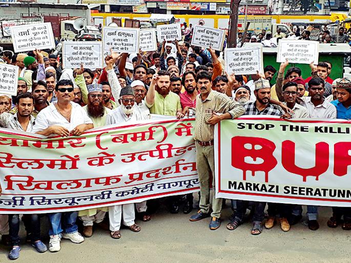 संविधान चौकात आॅल इंडिया मजलिस-ए-ईत्तेहादुल मुस्लिमीन नागपूर आणि मरकजी सिरतुन्नबी कमिटीच्या नेतृत्वाखाली निदर्शने आंदोलन करण्यात आले. प्रदर्शनापूर्वी सीए रोड, मशीद मीर फैज जवळ, मकरजी सिरतुन्नबी कमिटीच्या कार्यालयात सभा घेण्यात आली. सभेनंतर बर्मा सरकार मुर्दाबादच्या घोषणा देत आंदोलकांनी संविधान चौकापर्यंत मोर्चा काढला. संविधान चौकात आंदोलकांना मार्गदर्शन करताना मौलाना मुस्तफा म्हणाले, म्यानमारमधील दहशतवादाने सीमा गाठली आहे. एकाच समुदायाच्या नागरिकांवर अत्याचार होत आहेत. त्यामुळे भारत सरकारने याप्रकरणी हस्तक्षेप करून तेथील नागरिकांना मानवतेच्या दृष्टिकोनातून मदत करावी. मौलाना मुस्तफा रजा यांनीही यावेळी मनोगत व्यक्त केले. कमिटीच्या शिष्टमंडळाने निवासी उपजिल्हाधिकाºयांमार्फत पंतप्रधान नरेंद्र मोदी यांना निवेदन सादर केले. शिष्टमंडळात मरकजी सिरतुन्नबी कमिटीचे अध्यक्ष सय्यद मो. अली अशरफी, उपाध्यक्ष सय्यद परवेज रिजवी, अब्दुल लतीफ खान, उमरदराज खान, मो. कलाम, जावेद इकबाल, तारिक पटेल, वसीम खान, डॉ. ओवेश हसन, फैसल रंगूनवाला, अब्दुल रहमान, मौलाना मुस्तफा रजा, मौलाना अतीकुर्रहमान, आबिद ताजी, इरफान मुजावर, राजी अशफाक पटेल, हाजी शमीउल्लाह खान, हाजी मोहम्मद वाजीद, मो. समीर, मुश्ताक अली यांचा समावेश होता.