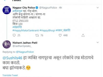 नागपूरपोलिसांनी मक्रर संक्रांतीच्या शुभेच्छा देताना एक मोबाईल नंबरही शेअर केला आहे. सर्वांना मकर संक्रांतीच्या शुभेच्छा, तिळगुळ घ्या गोड गोड बोला... असे म्हणत, जर कोणी कडू बोलत असेल आणि वागत असेल तर आम्हाला कळवा असंही नागपूर शहर पोलिसांनी आपल्या ट्विटर अकाऊंवरुन म्हटलं आहे. नागपूर पोलिसांच्या या ट्विटला काही भन्नाट रिप्लाय आले आहेत. त्यापैकी, एक रिप्लाय नक्कीच तुमच्या चेहऱ्यावर हसू आणल्याशिवाय राहणार नाही.
