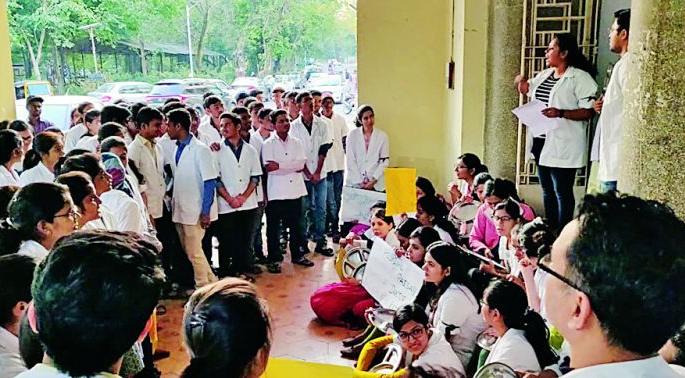 लोकमत न्यूज नेटवर्कनागपूर : शासकीय वैद्यकीय महाविद्यालय व रुग्णालयाच्या (मेडिकल) कणा असलेल्या निवासी डॉक्टरांना गेल्या दोन महिन्यांपासून विद्यावेतन मिळाले नाही. या विरोधात सोमवारपासून त्यांनी आंदोलनाला सुरुवात केली. बुधवारी ‘थाळी बजाओ’ आंदोलन करून मेडिकलचा परिसर दणाणून सोडला.रुग्णालयात २४ तास सेवा देऊनही वेळेवर विद्यावेतन मिळत नसल्याने राज्यात बहुसंख्य मेडिकल कॉलेजमध्ये निवासी डॉक्टरांचे आंदोलन सुरू आहे. नागपूर मेडिकलच्या निवासी डॉक्टरांना नोव्हेंबर व डिसेंबर या महिन्याचे अद्यापही विद्यावेतन मिळाले नाही. याकडे लक्ष वेधण्यासाठी सोमवारी निवासी डॉक्टरांनी काळी रिबीन बांधून रुग्ण सेवा दिली. बुधवारी ‘थाळी बजाओ’ आंदोलनातून लक्ष वेधले. विशेष म्हणजे, तीन महिन्यांपूर्वी असाच प्रश्न समोर आला होता. तेव्हा मेडिकल प्रशासनाने स्थानिकस्तरावर स्वत:च्या खात्यातून निवासी डॉक्टरांचे विद्यावेतन अदा केले. मात्र यावर कोषागार विभागाने आक्षेप नोंदविला. यातच दोन महिन्याचे विद्यावेतन देण्या एवढा निधी सध्या खात्यात नसल्याचे सांगण्यात येते. मेडिकलमधील निवासी डॉक्टरांच्या विद्यावेतनापोटी अद्याप १८ कोटी रुपयांची थकबाकी सरकारकडे शिल्लक आहे. ती रक्कम वळती झाल्यानंतरच हा तिढा सुटणार असल्याचे बोलले जात आहे.विद्यावेतनावर महिन्याकाठी दोन कोटी ४० लाखांचा खर्चमेडिकलमध्ये सुमारे ६०० निवासी डॉक्टर आहेत. तर वरिष्ठ निवासी डॉक्टरांची संख्या १५० इतकी आहे. त्यांच्या विद्यावेतनावर महिन्याकाठी दोन कोटी ४० लाख रुपये इतका खर्च होतो. नोव्हेंबरपासून डॉक्टरांना विद्यावेतनच मिळाले नाही. बुधवारी मोर्चा काढून मागण्यांकडे शासनाचे लक्ष वेधले. अधिष्ठाता कार्यालयासमोर शेकडो डॉक्टरांनी एकत्र येत शासनाविरोधात घोषणाबाजी केली. शासनाकडून डॉक्टरांचा छळ सुरू असून, विद्यावेतनाचा प्रश्न मार्गी न लागल्यास आंदोलन आणखी तीव्र करण्याचा इशारा मार्डच्या पदाधिकाऱ्यांनी दिला आहे.तीन दिवसांची मुदतआंदोलनाच्या पार्श्वभूमीवर मार्डचे पदाधिकारी व मुख्यमंत्री देवेंद्र फडणवीस यांच्यात बैठक झाली. या बैठकीत पुढील तीन दिवसांत विद्यावेतनाचा प्रश्न सोडवू, असे आश्वासन मुख्यमंत्री फडणवीस यांच्याकडून मिळाले आहे. यामुळे आता तीन दिवसानंतर आंदोलनाची भूमिका स्पष्ट होईल.डॉ. आशुतोष जाधवअध्यक्ष, मार्ड मेडिकल