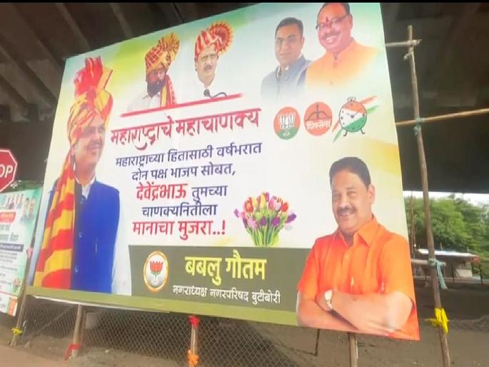 बुटीबोरी परिसरात देवेंद्र फडणवीस यांना वेगळी राजकीय उपाधी दिलेलं बॅनर लावण्यात आलं आहे. 'महाराष्ट्राचा महाचाणक्य’ म्हणून देवेंद्र फडणवीस यांचा त्यावर उल्लेख करण्यात आला आहे. ‘महाराष्ट्राच्या हितासाठी दोन पक्षांना भाजपसोबत आणणाऱ्या देवेंद्रभाऊ तुमच्या चाणक्यनितीला सलाम’ असा मजकूर या बॅनरवर छापण्यात आला आहे. या बॅनर्सवर देवेंद्र फडणवीस यांच्या शेजारी मुख्यमंत्री एकनाथ शिंदे, उपमुख्यमंत्री अजित पवार आणि भाजप प्रदेशाध्यक्ष चंद्रशेखर बावनकुळे यांचे फोटो देखील छापण्यात आले असून कमळ, घड्याळ आणि धणुष्यबाण हे तिन्ही पक्षांचे चिन्ह एकत्र दिसून येत आहेत.
