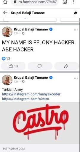 संयुक्त राष्ट्रसभेत भारताची बाजू मांडून पाकिस्तानला इशारा देणाऱ्या स्नेहा दुबे यांची फेसबुक पोस्ट रविवारी जागतिक कन्यादिनी खा. तुमाने यांनी पोस्ट केली. ती व्हायरल होत असतानाच सोमवारी पहाटे ५.३४ वाजता तुर्किश हॅकरने त्यांचे अकाऊंट हॅक केले. फेसबुकसोबतच ट्विटर अकाऊंट याच हॅकरने हॅक केले आहे. फेसबुकवरचा संदेश बदलवून ट्विटरचा डीपी बदलविला आहे. विशेष म्हणजे, हॅकरने त्यांच्या फेसबुक अकाऊंटवर हॅकिंग केल्याचे नमूद केले आहे. ‘माय नेम ईज फेलोनी हॅकर, ॲब हॅकर’ असे नमूद करतानाच त्याने लाल रंगात ‘कॅस्ट्रो’ असेही नमूद केले आहे. सोमवारी सकाळी हे दिसून आल्यानंतर खा. तुमाने यांनी सायबर पोलिसांकडे तक्रार दिली. पोलिसांनी गुन्हा दाखल करून प्रकरण तपासात घेतले आहे.