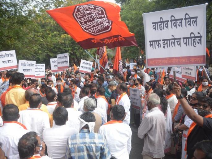 नागपूर : लॉकडाऊन काळात आलेले वाढीव वीज बिल माफ करण्याची मागणी तीव्र होत चालली आहे. भाजपानंतर आता महाराष्ट्र नवनिर्माण सेनेने गुरुवारी संविधान चौकात मोर्चा काढून ही मागणी लावून धरली. जिल्हाधिकारी कार्यालयाकडे जाण्यापासून रोखल्यामुळे कार्यकर्त्यांनी ठिय्या आंदोलन करून नाराजी व्यक्त केली.