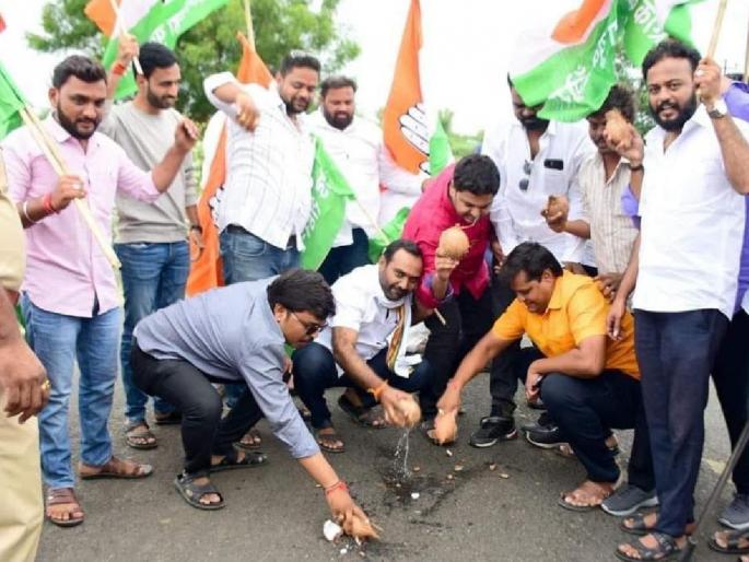 श्रीनिवास भोसलेनांदेड : राज्यातील सत्ता बदलानंतर मुख्यमंत्री एकनाथ शिंदे यांच्या हस्ते आसना नदीवरील पुलाचे नारळ फोडून भूमिपूजन करण्यात आले होते. जवळपास वर्ष लोटले तरी प्रत्यक्षात कामास सुरुवात झाली नाही. सरकारच्या या दिरंगाईचा काँग्रेसने नारळ फोडून निषेध नोंदवला. यावेळी आंदोलकर्त्यांना पोलीसांनी ताब्यात घेतले आहे.