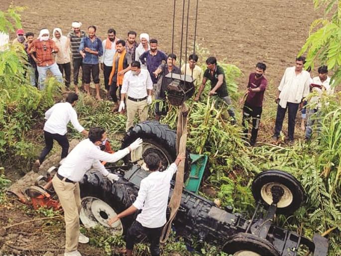 तुषार सूर्यभान कळणे (वय १५), पुरभाजी मारोतराव गिरे (वय २०़ दोघे रा. सरेगाव) अशी मयतांची नावे आहेत. दोघेही ट्रॅक्टरखाली दबून जागीच ठार झाले. बारड महामार्गाचे सपोनि येवते, जमादार शेख, स्वाधीन ढवळे, संतोष वागतकर, निलेवार, अमोल सातारे यांनी स्थानिकांच्या मदतीने मृतदेह बाहेर काढले. क्रेनच्या सहाय्याने ट्रॅक्टर बाहेर काढावे लागले. खरीप हंगामासाठी शेती मशागतीची कामे सुरू असून, ट्रॅक्टरचालक शेतकामे करून कच्च्या रस्त्यावरून जात असताना ट्रॅक्टर अचानक उलटून अपघात झाला.