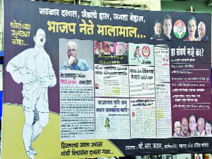 काँग्रेसने लावलेल्या बॅनर्समध्ये हिटलरचा फोटो टाकला असून देशात गांधी विचाराचा गळा दाबल्याचे नमूद केले़ सरकार दलाल, ज्येष्ठांचे हाल, जनता बेहाल व भाजप नेते मालामाल असा मथळा करण्यात आला होता़ त्यासोबतच यशवंत सिन्हा आणि स्थानिक नेत्या सूर्यकांता पाटील यांनी भाजपाला दिलेल्या घरच्या अहेराच्या बातमीचे कात्रणही टाकण्यात आले होते़ एम.जे.अकबर, राम कदम, बिपिन शर्मा यांच्या अनैतिकतेच्या वर्तनाचा या बॅनर्सवर उल्लेख करतानाच अमित शहा आणि ओवेसी यांची सिक्रेट डील, नोटबंदीनंतर अमित शहांच्या बँकेत जमा झालेले पाचशे कोटी रुपये या बातम्यांचा उल्लेख करीत, भाजपातील लालकृष्ण अडवाणी, मुरली मनोहर जोशी, एकनाथ खडसे हे कसे अडगळीला गेले़ यावर भाष्य करण्यात आले होते़ काँग्रेस आणि भाजपात रंगलेले हे बॅनरयुद्ध शहरवासियांसाठी मात्र चर्चेचा विषय झाले होते़