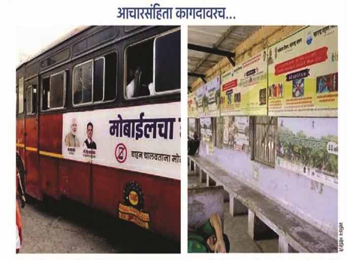 विभागीय आयुक्त सुनील केंद्रेकर, जिल्हाधिकारी अरुण डोंगरे यांनी यंत्रणांची बैठक घेवून आचारसंहिता लागू झाल्यानंतर २४ तासांच्या आत सर्व खाजगी मालमत्तेवरील पोस्टर्स, बॅनर्स, लेखन, झेंडे काढून घेण्याचे निर्देश दिले होते़ परंतु शहरातील मध्यवर्ती बसस्थानकात शासकीय योजनांची जाहिरात करणारे व त्यावर नेत्यांची छायाचित्रे, भिंतीवर विविध संघटनांचे राजकीय पक्षाशी संबंधित असलेले बॅनर लावण्यात आले होते़ ‘लोकमत’ ने बसस्थानकात आचारसंहितेचा भंग होत असल्याची बाब छायाचित्राच्या माध्यमातून उघड केली.