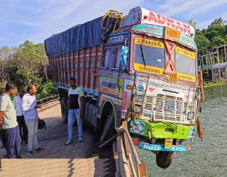 खड्डा चुकवला पण कठडे तोडून ट्रक पुलावर अडकला, सुदैवाने जीव वाचला