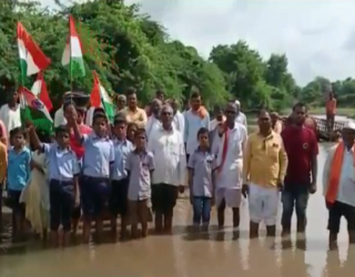 १० वर्षांपासून मागण्यांकडे दुर्लक्ष; नदी पात्रात राष्ट्रगीत गाऊन गावकऱ्यांनी केला शासनाचा निषेध