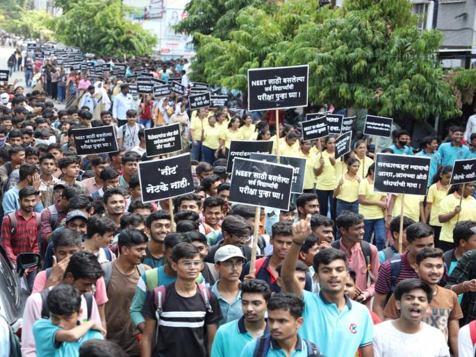 नांदेड- नीट परिक्षेत घालून ठेवलेल्या गोंधळामुळे लाखो विद्यार्थ्यांचे भवितव्य टांगणीला लागले असून ही परिक्षा रद्द करुन नव्याने घेण्यात यावी या मागणीसाठी शुक्रवारी हजारो विद्यार्थी नांदेडच्या रस्त्यावर उतरले होते. त्यांनी एनटीएच्या विरोधात जोरदार घोषणाबाजी केली.
