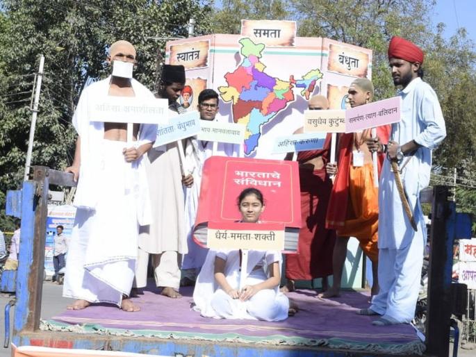 शहाद्याच्या महात्मा फुले चौकातील कृषीभवनपासून पथसंचलनाला सुरुवात झाली. बसस्थानक, नगरपालिका चौक, खेतीया रोड, येथून पथसंचलन जात असताना रस्त्याच्या दूतर्फा तरुण, तरुणी अबाल व वृध्दांनी प्रचंड गर्दी केली होती. दरम्यान, शिवछत्रपती ग्रुप, संकल्प ग्रुपच्यावतीने पालिका चौकात व जमीअत उलेमाच्यावतीने शोभायात्रेत सहभागी झालेल्या कलावंतांचे शीतपेय देऊन स्वागत करण्यात आले. सायंकाळी ५ वाजता या पथसंचलनाची सांगता झाली.