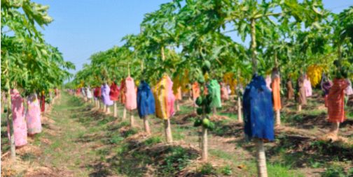 पपईच्या झाडांवर रंगीबेरंगी कापडाचे आवरण
