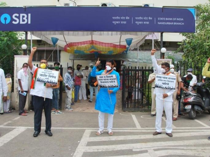 लोकमत न्यूज नेटवर्कनंदुरबार : ठप्प असलेले पीककर्ज वाटप, कर्जमाफीची अंमलबजावणी बाबत उदासिनता याच्या निषेधार्थ राज्य सरकारविरोधात भाजपतर्फे सोमवारी निदर्शने करण्यात आली. यानंतर तहसीलदारांना निवेदनही देण्यात आले. याशिवाय तळोदा येथेही निदर्शने करण्यात आली.स्टेट बँकेच्या बाहेर सोमवारी दुपारी जिल्हाध्यक्ष विजय चौधरी यांच्या अध्यक्षतेखाली निदर्शने झाली. त्यानंतर तहसीलदारांना निवेदन देण्यात आले. निवेदनात म्हटले आहे की, देशाचा मालक असलेला शेतकरी महाआघाडी सरकारच्या चुकीच्या धोरणामुळे संकटात सापडला आहे. पावसाने हजेरी लावली आहे. शेत जमीनीत ओलावा आहे. अशा वेळी शेतकऱ्यांना बि-बियाणे, खत व औषधी खरेदीसाठी पीक कर्जाची तातडीची आवश्यकता असतांना शेतकऱ्यांना चकरा माराव्या लागत आहेत. कोरोना महामारीच्या अनुषंगाने उत्पादीत मालाला अपेक्षीत भाव मिळाला नाही शेतकºयाने शेतीसाठी केलेला खर्च देखील निघालेला नाही. आधीच कोरोनामुळे अडचणीत सापडलेला शेतकरी सरकारच्या चुकीच्या धोरणामुळे त्रस्त झाला आहे. शेतकºयाला संकटातून बाहेर काढण्यासाठी पीक कर्ज उपलब्ध करून मागील सर्व कर्ज माफ करावे. शेतकºयांच्या बांधावर तात्काळ खते, बियाणे, किटकनाशक पुरवठा करावा अशी मागणी या निवेदनात करण्यात आली आहे. निवेदनावर जिल्हाध्यक्ष विजय चौधरी यांच्यासह राजेंद्रकुमार गावीत, महेंद्र पटेल, नरेंद्र माळी, हर्षल पाटील, बुधाभाई पाटील, संजय पटेल, दशरथ पटेल, विलास पटेल आदींच्या सह्या आहेत. तळोद्यात देखील निदर्शने करण्यात आली. कार्यकर्ते उपस्थित होते.