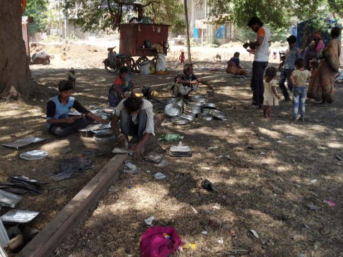 लोकमत न्यूज नेटवर्कशहादा : कोरोनाच्या पार्श्वभूमीवर लॉकडाऊनचे काटेकोर पालन करून प्रत्येक जण जिवाच्या भीतीने घराबाहेर पडणे टाळत असताना पोटाची खळगी भरण्यासाठी स्थलांतर करून हातावर पोट भरणारे व शेतीकामात झोकून दिलेल्या मजुरांचा जीवनसंघर्ष मात्र सुरूच आहे. भूकेने मरण्याची जास्त भीती असल्याने हे हातकामावर जगणाऱ्यांना कोरोनाचे कोणतेच भय न बाळगता संसाराचे गाडे ओढत आहेत.शहादा शहरातील चौफेर असलेल्या मोकळ्या पटांगणात पत्र्याच्या सहाय्याने वस्तू बनवून विकणारे, भिक्षुकी करणारे, शेतमजूर व इतर स्थलांतरित नागरिक मोठ्या प्रमाणावर वास्तव्य करतात. शहरात बरेच कुटुंब असे हातावरचे काम करण्यासाठी रहात आहेत. मात्र सध्या कोरोनाच्या पार्श्वभूमीवर सर्वत्र लॉकडाऊन असल्याने सर्व नागरिक घरात आहेत. शहरात कोरोना रुग्णांची वाढती संख्या बघता नागरिकांमध्ये भीती पसरली असताना दुसरीकडे मात्र हे असे हातावर काम करणाºयांना कोरोनाचे काहीच घेणे-देणे नसल्याचे दिसते. हे मजूर, हातावर काम करणारे कुटुंबासोबत नेहमीप्रमाणे आपल्या कामात व्यस्त असल्याचे दिसून येत आहे. हे स्थलांतरित हातावर काम असलेले मजूर शहरातील अनेक भागांमध्ये तंबू लावून राहतात. दिवसभर काही हातावरचे काम करून सायंकाळी त्यांच्या स्वयंपाकाची व्यवस्था होते. मात्र लॉकडाऊन असल्याने त्यांना कोणतेच हातावरचे काम व वस्तू विकता येत नसल्याने त्यांना अडचणींचा सामना करावा लागत आहे. काही स्वयंसेवी संस्थांकडून तात्पुरत्या जेवणाची व्यवस्था होत असली तरी पुढील काळात संसाराचा गाडा हाकण्यासाठी कोरोनाचा सामना करत संपूर्ण कुटुंब आपल्या दैनंदिन कामात लक्ष देत वस्तू तयार करीत आहेत. अशा गरजू लोकांकडे प्रशासनाने लक्ष देण्याची गरज भासत आहे. सामाजिक स्वयंसेवी संस्था तात्पुरत्या स्वरुपाची सोय करत असल्या तरी लॉकडाऊनचा कालावधी वाढल्यास त्यांच्या पोटाचा प्रश्न गंभीर रूप धारण करणार आहे. कदाचित याची भनक त्यांना लागल्याने ते उन्हाची आणि कोरोनाची पर्वा न करतात आपल्या पोटाची खळगी भरण्यासाठी दिवस-रात्र परिश्रम करताना दिसून येत आहेत.