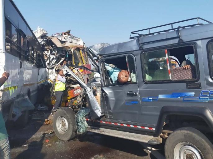 मृतात मालेगावच्या निकम परिवारातील अशोक निकम, विश्वास रतन निकम, समाधान निकम या तिघांचा समावेश आहे. जीप मधील सहप्रवाशी प्रतिभा समाधान निकम (३०), दिपक देवराम निकम (५०), बाळा दौलत पवार (६०), कैलास रतन निकम (६५), नितीन दाऊल शिंदे (२०), महेश संतोष निकम (३५), सुरेखा अताळे (४०), सुरेश दौलम निकम (६०), उमेश अरुण पवार (२६), राजेंद्र रामदास निकम (५४), प्रितेश अजय निकम (२०), सरला रामदास सामुद्रे (३०), सुरेशखा मुरलीधर निकम (५०), संजय आत्माराम निकम (४०), राजेंद्र रामदास निकम (३५) सर्व रा.मालेगाव, प्रिती सुरेश वसावा (१८) रा.निमदर्डा, ता.नवापूर, सागर रमण गोस्वामी (२६), राहुल राजू गोस्वामी (२६) रा.नवापूर असे महाराष्टÑातील जखमींची नावे आहेत. याशिवाय गुजरातमधील सोनगड व व्यारा येथील काही जणांचा समावेश आहे.