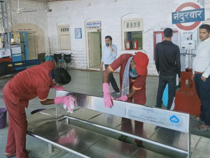 लोकमत न्यूज नेटवर्कनंदुरबार : कोरोनाच्या पार्श्वभुमीवर रेल्वे आणि बसस्थानकात विशेष दक्षता घेतली जात आहे. रेल्वे स्थानकातील सर्वच ठिकाणी स्वच्छता केली जात आहे. रेल्वेच्या आरोग्य विभागाने बुधवारी येथे पहाणी करून एकुण स्थितीची माहिती घेतली. तसेच खाद्यपदार्थ विक्री करणाऱ्यांना सक्त सुचना देण्यात आल्या आहेत. दरम्यान, बसस्थानकात देखील स्वच्छतेच्या दृष्टीने काळजी घेतली जात आहे. सर्व बसेस नियमित स्वच्छ केल्या जात आहेत.कोरोनाचा प्रादुर्भाव हा सर्वात जास्त गर्दीच्या ठिकाणी होण्याची शक्यता आहे. ही बाब लक्षात घेता गर्दी होणाºया रेल्वे आणि बसस्थानकांच्या ठिकाणी विशेष काळजी घेण्याच्या सुचना शासनाने दिल्या आहेत. त्यादृष्टीने संबधीत विभाग कामाला लागला आहे.रेल्वे स्थानकात नियमित स्वच्छतेला महत्व दिले जात आहे. दिवसातून तीन वेळा स्वच्छता केली जात आहे. शिवाय प्रवासी सर्वाधिक ज्या ठिकाणी स्पर्श करतात अशा ठिकााणी सॅनिटायझरने स्वच्छता कर्मचारी स्वच्छता करीत आहे. यात बसण्याचे बाक, पादचारी पूल, तिकीट खिडकी, खाद्य पदार्थाचे स्टॉल, पिण्याच्या पाण्याचे नळ, स्वच्छतागृह यांचा समावेश आहे. फलाट फार्मवर कचरा होऊ नये यासाठी विशेष प्रयत्न केले जात आहे.बुधवारपासून दिवसातून तीन वेळा स्वच्छता करण्यावर भर दिला जात आहे. यासाठी स्वच्छता कर्मचाऱ्यांना विशिष्ट ड्रेस, मास्क, ग्लोव्हज दिले जात आहे. येणाºया व जाणाºया सर्व प्रवासी गाड्यांमध्ये देखील स्वच्छता केली जात आहे.आरोग्य व स्वच्छता विभागरेल्वेच्या आरोग्य व स्वच्छता विभागाने बुधवारी रेल्वे स्थानकात भेट देत स्वच्छतेच्या कामांची पहाणी केली. विविध खाद्य पदार्थांच्या स्टॉलवर जावून तेथील पदार्थांचा दर्जा, स्वच्छता आणि खाद्यपदार्थ बनविणाºयांच्या आरोग्याची माहिती घेतली. तसेच काही सुचना देखील दिल्या. यावेळी स्टेशन प्रबंधक वसंतलाल मंडल, उपस्टेशन अधीक्षक प्रमोद ठाकुर यांच्यासह रेल्वे प्रवासी सल्लागार समितीचे सदस्य जवाहर जैन आदी उपस्थित होते.प्रवासी संख्या रोडावलीरेल्वेची प्रवासी संख्या ३० टक्के रोडावली आहे. याशिवाय स्थानकावर येणाºयांची संख्या देखील कमी झाली आहे. गर्दीवर नियंत्रणासाठी रेल्वेने फ्लॅटफॉर्म तिकिट वाढविले आहे. त्याचाही परिणाम दिसून येत आहे.बसस्थाकावरही दक्षताबसस्थानकातही दक्षता घेतली जात आहे. जिल्ह्यातील नंदुरबार, नवापूर, शहादा, अक्कलकुवा येथे स्वच्छतेवर भर दिला जात आहे. सर्वच एस.टी.बसेसची नियमित स्वच्छता केली जात आहे. बसस्थानक आवारातील कचºयाची वेळोवेळी विल्हेवाट लावली जात आहे. प्रवाशांना ध्वनीक्षेपकाद्वारे कोरोना आजाराविषयी आणि त्याविषयी दक्षता बाळगण्यासंदर्भात सुचना दिल्या आहेत.रेल