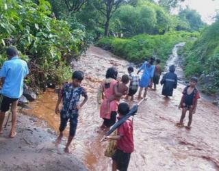 वालंबातील बालकांची अंगणवाडीत जाण्यासाठी नदीतील पाण्यातून कसरत