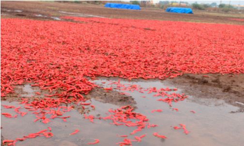 सततच्या पावसामुळे पथारींवर पाणी साचले आहे. काळी मातीच्या परिसर असल्यामुळे चिखलाचे देखील साम्राज्य निर्माण झाले आहे. त्यामुळे मिरचीचे मोठ्या प्रमाणावर नुकसान झाले आहे.