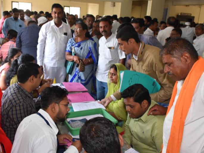 लोकमत न्यूज नेटवर्कनंदुरबार : अपेक्षेप्रमाणे शेवटच्या दिवशी उमेदवारी अर्ज दाखल करण्यासाठी प्रचंड गर्दी झाल्याने सर्वच तहसील कार्यालयांना यात्रेचे स्वरूप आले होते. नंदुरबारात दुपारी तीन वाजेपर्यंत निवडणूक निर्णय अधिकारी यांच्या कार्यालयाच्या परिसरात जेवढे उमेदवार उभे होते त्या सर्वांना अर्ज दाखल करण्याची संधी देण्यात आली. सायंकाळी उशीरापर्यंत अर्ज दाखल करून घेतले जात होते.जिल्हा परिषदेच्या ५६ आणि पंचायत समितींच्चा ११२ गणांसाठी उमेदवारी अर्ज दाखल करण्याची सोमवार, २४ रोजी शेवटची मुदत होती. गेल्या सहा दिवसांपासून उमेदवारी अर्ज स्विकारले जात असले तरी इच्छूक उमेदवारांनी फारशी उत्सूकता दाखविली नव्हती. शनिवारी थोडेफार अर्ज दाखल झाले. त्यामुळे सोमवारीच प्रचंड गर्दी होण्याची शक्यता होती. अपेक्षेप्रमाणे सकाळी दहा वाजेपासूनच विविध राजकीय पक्षांच्या उमेदवाराची आणि समर्थकांची गर्दी त्या त्या निवडणूक निर्णय अधिकारी यांच्या कार्यालय परिसरात झाली होती. त्यामुळे अनेक ठिकाणी बॅरेकेटींग लावण्यात आले होते.उमेदवारी अर्ज आधी आॅनलाईन भरावे लागत होते. त्यानंतर त्याची प्रिंट काढून आवश्यक त्या कागदपत्रांसह अर्ज निवडणूक निर्णय अधिकारी यांच्याकडे सादर करावा लागत होता. ही प्रक्रिया अनेकांच्या पचनी पडली नाही. त्यामुळे इच्छूक उमेदवारांचा प्रचंड गोंधळ उडाला. परिणामी अनेकजण उमेदवारी अर्जापासून वंचीत राहिले किंवा भरतांना काही त्रुटी राहण्याची शक्यता निर्माण झाली आहे.रांगेतील सर्वांनाच संधीनंदुरबार येथे दुपारी अर्ज दाखल करणाऱ्यांची एकच गर्दी झाली. दुपारी तीन वाजेपर्यंत अंतिम मुदत होती. त्या वेळेपर्यंत जेवढे इच्छूक उमेदवार अर्ज दाखल करण्यासाठी निवडणूक निर्णय अधिकारी यांच्या कार्यालयाच्या आवारात होते त्या सर्वांनाच अर्ज दाखल करण्याची संधी देण्यात आली. दुपारी तीन वाजेनंतर रांगेत तब्बल ७० ते ७५ इच्छुक उमेदवार होते. परिणामी त्या सर्वांचे अर्ज दाखल करून घेण्यासाठी सायंकाळी उशीरापर्यंत प्रक्रिया सुरू होती.दिग्गजांचा समावेशअर्ज दाखल करणाऱ्यांमध्ये कुमुदिनी विजयकुमार गावीत, अॅड.राम चंद्रकांत रघुवंशी, संध्या वकिल पाटील, अर्चना शरद गावीत, सुशिला भरत पाटील, स्मिता दीपक दिघे, अनिल पाटील, योगिनी अमोल भारती, सुनिता रवींद्र पाटील यांच्यासह इतरांचा समावेश आहे. अनेक गटात रंगतदार लढती राहणार आहे.पोलीस बंदोबस्ततहसील कार्यालय आवारात मोठ्या प्रमाणावर पोलीस बंदोबस्त लावण्यात आला होता. मुख्य प्रवेशद्वारावर केवळ इच्छूक उमेदवार व त्यांच्या सोबत इतर चार ते पाच जणांनाच आत सोडण्यात येत होते. उमेदवारांच्या समर्थकांना मात्र प्रवेश द्वाराबाहेरच थांबावे ल