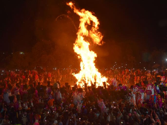 भूषण रामराजे ।लोकमत न्यूज नेटवर्कनंदुरबार : जगातील मनुष्यासह, प्राणीमात्र, झाडे, पक्षी यांच्यासह सर्वच जीवजंतूंवर होळी आईने कृपा कायम ठेवावी अशी प्रार्थना करत काठीची राजवाडी होळी पेटवण्यात आली़ यावेळी ढोल, मांदल, बिरी आणि बावा बुध्या यांच्या कंबरेला बांधलेल्या तुंबड्यातून निघणाऱ्या स्वरांनी संपूर्ण सातपुडा दुमदुमत होता़९०० वर्षांपासून अधिकची परंपरा असलेल्या राजवाडी होळीनिमित्त सोमवारी दुपारपासूनच काठी गावाकडे सातपुड्यासह नंदुरबार जिल्हा तसेच राज्य आणि परराज्यातील पर्यटकांची पावले वळली होती़ राजवाडी होळीच्या पार्श्वभूमीवर याठिकाणी मुख्य चौकात बावा, बुध्या, ढाणका यांच्या विविध पथकांनी नृत्याला सुरुवात केली होती़ डफ, मांदल, पारंपरिक ढोल यांच्या सुंदर स्वरांनी सायंकाळपासून रंगत आणली होती़ राजवाडी होळीसाठी पालकमंत्री अॅड़ के़सी़पाडवी, जिल्हा परिषदेच्या अध्यक्षा अॅड़ सीमा वळवी, आमदार डॉ़ विजयकुमार गावीत, माजीमंत्री अॅड़ पद्माकर वळवी, जिल्हा परिषद सदस्य सीक़े़पाडवी, धुळे जिल्हा काँग्रेसचे जिल्हाध्यक्ष शाम सनेर, यांच्यासह विविध मान्यवर याठिकाणी हजर झाले होते़ दरम्यान जिल्ह्यातील विविध शासकीय विभागांचे प्रमुख अधिकारी व कर्मचारी हे ही रात्री उशिरापर्यंत काठी येथे थांबून होते़ रात्री उशिरापर्यंत मान्यवरांनी सुरु असलेला मेलादा आणि नृत्य पथकांच्या भेटी घेत त्यांचा उत्साह वाढवला होता़ काठीची राजवाडी होळी पाहता यावी यासाठी काठी गावातील चौकापासून लगतच असलेल्या गायत्री माता टेकडीवर शेकडोंच्या संख्येने महिला, पुुरुष आणि लहान बालके रात्रभर बसून होळीनृत्याची रंगत अनुभवत होते़ वातावरणा गारठा निर्माण होऊन रात्रभर महिला याच ठिकाणी बसून होत्या़ उत्सावाच्या पार्श्वभूमीवर काठी येथे मेलाद्याचे आयोजन करण्यात आले होते़ यात खाद्यपदार्थ, खेळणी, मनोरंजनाची साधने, पाळणे आदींचा समावेश होता़ होळीमातेला अर्पण करण्यासाठी संत्रे, गूळ, दाळ्या, हारकंगन यांचीही दुकाने याठिकाणी सजली होती़ रात्रभर सुरु असलेल्या या मेलाद्यात लाखो रुपयांची उलाढाल झाली़पहाटे सहा वाजता होळीचे मानकरी काठी संस्थानचे वारसदार पृथ्वीसिंग पाडवी यांच्याहस्ते होळी पूजन करुन पेटवण्यात आली़ तत्पूर्वी पुजारांच्या हस्ते विधिवत पूजन करुन होळीमातेची आराधना करण्यात आली़ यावेळी स्थानिक बोलीभाषेत पुजारांनी ‘होळी माते सर्वांनाच सुखी ठेव’ अशी प्रार्थना होळी पेटवण्याची सूचना केली़ सुमारे ७० फुटांच्या उंच बांबूच्या शेंड्यावर खोबरे, पाच भाकरी, हारकंगन आदी लावून सजवण्यात आले होते़ होळी प्रज्वलित केल्यानंतर उंच बांबूचा दांडा पूर्व दिशेला कोसळल्यावर उपस्थितांनी धाºय