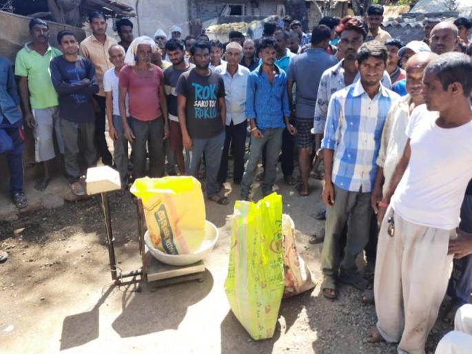 याबाबत सविस्तर वृत्त असे की, आडगाव येथील रेशन दुकानदार पी.एस. रावताळे यांनी गुरुवारी सकाळी धान्य वाटप करण्यासाठी सुरुवात केली. लाभार्थी दिलेले धान्य घरी घेऊन जात होते. त्यातील एका लाभार्थीने घरी धान्य मोजले असता प्रत्येक धान्यामागे किमान दोन किलो धान्य कमी निघाल्याचे निदर्शनास आले. काही ग्रामस्थांनी रेशन दुकानात जाऊन धान्य घेतले व तेथेच नवीन मोजमाप केले. त्यात लाभार्थी युवराज जºया वाघ याला २० किलो तांदूळ दिले होते. मात्र ते पुन्हा मोजले असता १८ किलो ८०० ग्रॅम एवढे वजन भरल. १० किलो गहू हे आठ किलो ८०० ग्रॅम एवढेच भरले. यावरुन स्वस्त धान्य दुकानदार हा मापात पाप करीत असल्याचे स्पष्ट झाले. दिवाण सुकºया खर्डे यांनीही १६ किलो तांदूळ घेतले होते ते मुळात १४ किलो ७०० ग्रॅम एवढेच भरले. विशेषत: हे सर्व धान्य त्याच रेशन दुकानदाराच्या वजन काट्यावर मोजण्यात आले होते. याबाबत ग्रामस्थांनी संतप्त भावना व्यक्त करीत दुकानाबाहेर एकच गर्दी केली होती. रेशन दुकानदार पीओएस माशीनमधील पावत्याही देत नसल्याचे गावकऱ्यांनी सांगितले. मोजून कमी भरलेले धान्य व वजन काटा गावकºयांनी ताब्यात घेऊन ग्रामपंचायतीच्या खोलीत जमा केला आहे व वरिष्ठ अधिकारी आल्यावर त्यांना दाखवू, असा पवित्रा घेतला आहे.