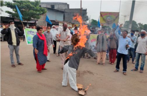 नंदुरबार : गेल्या १५ दिवसांपासून दिल्लीत भारतीय किसान संघर्ष समितीतर्फे सुरू असलेल्या आंदोलनाला पाठिंबा देण्यासाठी सोमवारी शहरातील बिरसा मुंडा चौकात नर्मदा बचाव आंदोलनाच्या वतीने काॅर्पोरेट कंपन्यांचा प्रतीकात्मक पुतळा जाळण्यात आला. यावेळी केंद्र सरकारच्या विरोधात घोषणाबाजी करण्यात आली.