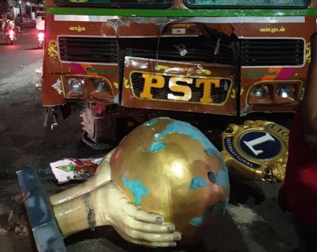 ट्रक गिअरच्या माध्यमातून नियंत्रणात आणण्याचा प्रयत्न केला. परंतु त्यात यश येत नसल्याचे पाहून चालकाने ट्रक थांबविण्यासाठी थेट स्टेट बँकसमोरील रस्ता दुभाजकात लायन्सने उभारलेल्या पृथ्वीच्या प्रतिकृतीला धडक दिली. त्यात पृथ्वीच्या प्रतिकृतीचा स्तंभ पुर्णत: ट्रकखाली दाबला गेला. त्यामुळे ट्रक थांबण्यास मदत झाली. सुदैवाने यावेळी कुणीही दुचाकी किंवा इतर वाहन त्यावेळी आले नसल्याने मोठा अनर्थ टळला.