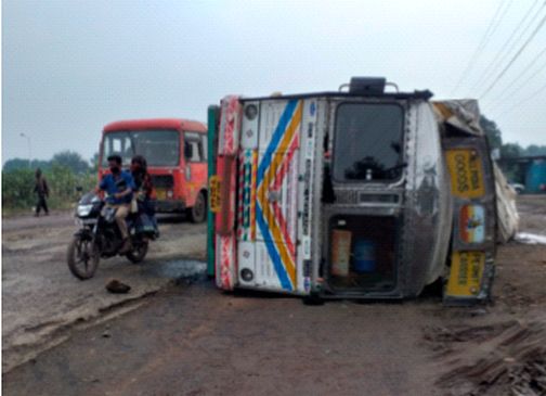 नागपूरहून अहमदाबादकडे केमिकल वाहून नेणारा ट्रक क्रमांक एमएच ४० वाय-९२४४ रविवारी रात्री महामार्गावर वाण्याविहीर ते अक्कलकुवादरम्यान अचानक उलटल्याचे दिसून आले. भरधाव वेगातील ट्रक खड्ड्यात आदळून हा अपघात घडल्याचे सांगण्यात आले आहे. अपघातात चालक आणि वाहक दोघेही बचावले असल्याची माहिती आहे. दरम्यान, पोलिसांना माहिती मिळाल्यानंतर त्यांनी घटनास्थळी धाव घेत माहिती जाणून घेतली. शेवाळी ते नेत्रंग महामार्गावर वाण्याविहीर ते राजमोही व अक्कलकुवा शहरादरम्यान मोठेमोठे खड्डे पडून रस्त्याची प्रचंड दुरवस्था झाली आहे. यातून वाहनधारक खड्डे टाळण्यासाठी भरधाव वेगातही कसरत करत आहेत. याच दरम्यान अशा प्रकारचे अपघात होत आहेत. या महामार्गाच्या दुरुस्तीसाठी कोट्यवधी रुपयांचा निधी प्राप्त होऊनही कारवाई करण्यात आलेली नसल्याने नाराजी व्यक्त करण्यात येत आहे.
