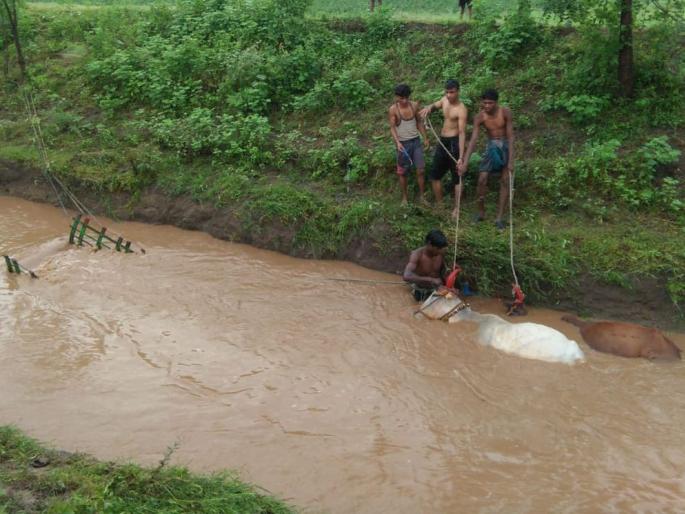 नाल्याच्या पुरात बुडून दोन बैलांचा मृत्यू