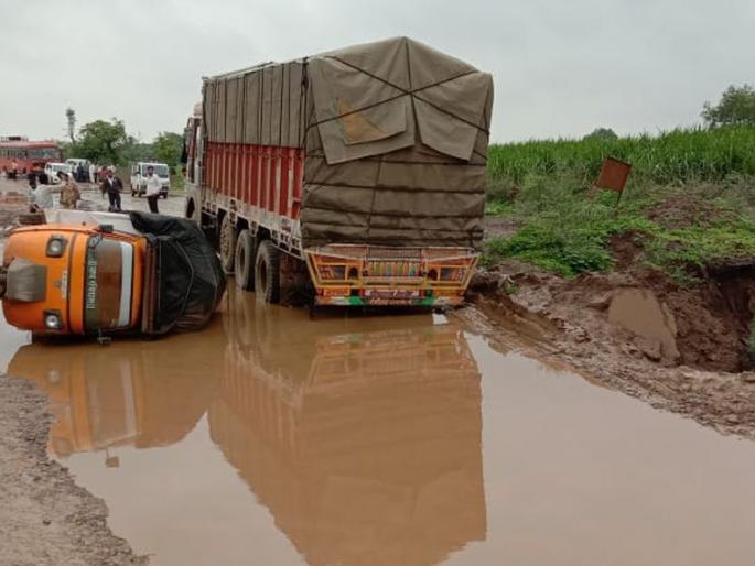 सेंधवा ते विसरवाडी या मार्गाचे रुंदीकरणाचे काम गेल्या काही महिन्यांपासून बंद करण्यात आले आह़े नंदुरबार ते प्रकाशा दरम्यान कोळदा ते कोरीट गावाच्या अलीकडेर्पयत रस्ता रुंदीकरण व काँक्रिटीकरण पूर्ण झाले आह़े परंतू कोरीट फाटय़ाजवळील नाल्याजवळ केवळ मातीचा भराव करण्यात आला होता़ दोन दिवसात झालेल्या पावसामुळे नाल्याच्या पाण्यामुळे रस्त्याच्या कडेला भगदाड पडले होत़े रविवारी रात्री पाणी जास्त झाल्याने रस्त्यार्पयत भगदाडाची रुंदी वाढून रस्त्यात पाणी साचल़े यातून सोमवारी सकाळी येथे रिक्षा उलटली़ तसेच अवजड ट्रक फसून नंदुरबार ते शहादा दरम्यान होणारी वाहतूक थांबवण्यात आली़ सायंकाळर्पयत पाऊस सुरु असल्याने खड्डा बुजवला गेला नव्हता़ सकाळी चार तास मार्गावरील वाहतूक बंद असल्याने वाहनधारकांनी पर्यायी मार्गाचा अवलंब केला़ लगतच्या यावल आणि कोरीट मार्गाने वाहनांची नंदुरबारकडे वाहतूक सुरु होती़ रात्रीही येथे वाहने अडकत होत़े