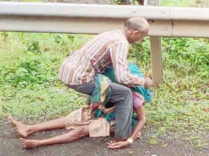 घटनेत मयत झालेल्या महिलेला रुग्णालयात नेण्यासाठी वाहन न मिळाल्याने तिच्या पतीने खांद्यावर टाकून मार्गक्रमण सुरू केल्याचे ह्रदयद्रावक चित्र यावेळी समोर आले.