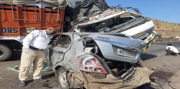 मालेगावकडे जाणाºया मारुती सुझुकी कारचा (क्र. एमएच ०१ एएक्स ६९०३) वेग कमी झाल्याने मागून येणारा आयशर टेम्पो (क्र. एमएच १० झेड ३२९८) कारवर आदळला. त्यापाठोपाठ राजस्थानचा ट्रक (क्र. आरजे ११ जीए ४४७७) व दुसरा ट्रक (क्र. आरजे ०५ जीबी ०९०७) या दोन ट्रक आदळल्याने या अपघातातील सुमारे २६ प्रवाशी जखमी झाले.