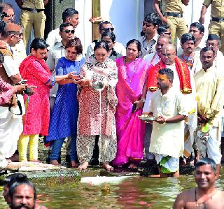 नाशिक : सिंहस्थ कुंभमेळ्यानिमित्त शुक्रवारी सकाळी १० वाजता गुजरातच्या मुख्यमंत्री आनंदीबेन पटेल यांनी रामकुंडावर गोदावरी मातेचे अभिषेक व पूजन करून पवित्र स्नान केले. तसेच गंगा गोदावरी मंदिरात जाऊन दर्शन घेतले. दरम्यान, त्यापूर्वी केंद्रीयमंत्री हंसराज अहिर यांनीदेखील सकाळी ९.१५ वाजता रामकुंडावर गोदापूजन करून पवित्र स्नान केले. यावेळी गोदाघाटावर मोठा पोलीस बंदोबस्त होता.त्र्यंबकेश्वर येथील तिसऱ्या शाही पर्वणीच्या पार्श्वभूमीवर शुक्रवारी नाशिक येथे गोदावरीत पवित्र स्नान करण्यासाठी साधू-महंत व भाविकांसह राजकीय नेते व पदाधिकाऱ्यांनी गर्दी केली होती. सकाळी ९ वाजेच्या सुमारास केंद्रीयमंत्री हंसराज अहिर यांचा वाहन ताफा रामकुंड पोलीस चौकी परिसरात आला. त्यानंतर अहिर यांनी लगेचच रामकुंडावर जाऊन गोदामातेचे पूजन करून पवित्र स्नान केले. गंगागोदावरी मंदिरात पुरोहित संघातर्फे त्यांचा सत्कार करण्यात आला. त्यानंतर एक तासाने गुजरातच्या मुख्यमंत्री आनंदीबेन पटेल या आपल्या कुटुंबीयांसमवेत रामकुंडावर आल्या. गोदामातेला अभिषेक व पूजन करून त्यांनी पवित्र स्नान केले. त्यांच्या समवेत गुजरातचे उच्चशिक्षणमंत्री वसू त्रिवेदी व आमदार देवयानी फरांदे होत्या. गंगा गोदावरी मंदिरात जाऊन पटेल कुटुंबीयांनी दर्शन घेतले. पुरोहित संघातर्फे सतीश शुक्ल यांनी सर्वांचा सत्कार केला व सिंहस्थ कुंभमेळ्याचे महत्त्व सांगितले. याप्रसंगी श्री काळाराम मंदिराचे महंत सुधीरदास पुजारी, अतुल गायधनी, नितीन पाराशरे, चंद्रशेखर पंचाक्षरी, अलोक गायधनी आदि उपस्थित होते. (प्रतिनिधी)