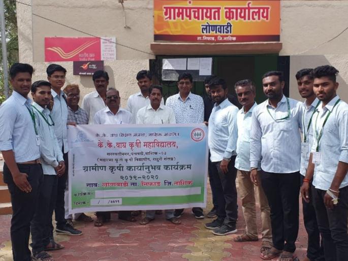 लोणवाडी येथे के. के. वाघ कृषिमहाविद्यालय नाशिक येथील कृषीदूतांचे आगमन झाले या कृषिदूतांनी शेतकर्याना ग्रामीण कृषी कार्यानुभव कार्यक्र मांतर्गत २२ आठवडे घेण्यात येणाºया उपक्र माची माहिती दिली. के. के .वाघ कृषी महाविद्यालयाचे प्राचार्य डॉ. एस. एम. हाडोळे व कार्यक्र म समन्वयक प्रा. टी. बी. उगले, प्रा. पी. बी. पवार, प्रा. व्ही. सी कोरडे, प्रा. एन. बी. भोकनाळ यांनी मार्गदर्शन केले. यावेळी प्रगतशील शेतकरी दिनकर दौंड, प्रभाकर चोपडे, गोकुळ चोपडे, बाळासाहेब गरु ड, शामराव गवळी, विकास जाधव, रामकृष्ण सावळे, युवा शेतकरी गोकुळ दौंड हे उपस्थित होते. याप्रसंगी मयूर शिंदे, यज्ञेश पानगव्हाणे, तुषार शिंदे, सुर्यप्रताप कोरे, प्रफुल्ल शिरसाठ, आकाश लाळगे उपस्थित होते. सुत्रसंचलन मोरे व आभार कृषीदूत हर्षल आवारे यांनी मानले.