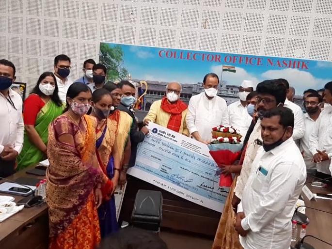 अवनखेड ग्रामपंचायतीचा राज्यस्तरीय पुरस्कार उपमुख्यमंत्री अजित पवार, छगन भुजबळ यांच्या हस्ते स्वीकारताना नरेंद्र जाधव, विनोद जाधव, महिला सदस्य.