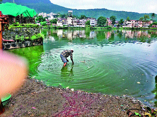 गणपती विसर्जन करण्याच्या एकमेव असलेल्या गौतम तलावात लाखो मासे मृत झाल्यानंतर तलावाभोवती नागरिकांनी गर्दी केली.