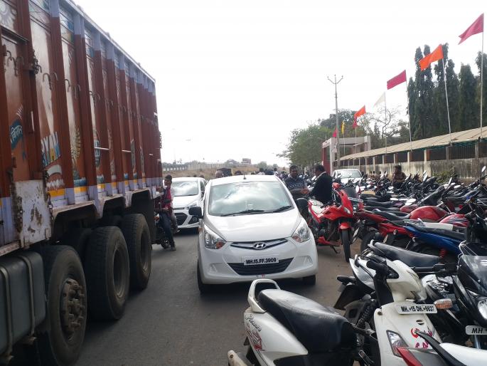 महाविद्यालयातील वाहन पार्किंगच्या जागेवर खाद्यपदार्थचे स्टोल लावल्याने विद्यार्थ्यांना आपली वाहने बाहेर पार्क करावी लागल्यामुळे झालेली वाहतूक कोंडी.