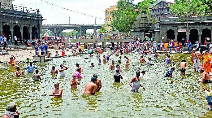 नाशिकमध्ये सूर्यग्रहण काळात रामकुंडात स्नान व मंत्रोच्चाराचा जप करताना भाविक.
