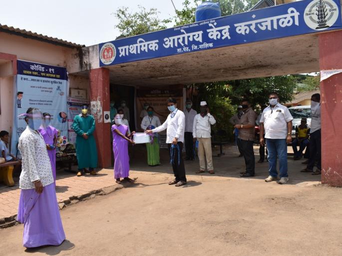 पेठ : ग्रामीण भागात कोरोना विषाणूचा प्रादुर्भाव होऊ नये यासाठी आरोग्य विभागाच्या वतीने उपाययोजना केल्या जात असून, यासाठी नियुक्त केलेल्या आरोग्य व सरकारी कर्मचाऱ्यांची काळजी घेतली जावी म्हणून सुरक्षा साहित्याचे वाटप करण्यात आले. करंजाळी प्राथमिक आरोग्य केंद्र येथे तालुका आरोग्य अधिकारी डॉ. मोतीलाल पाटील व वैद्यकीय अधिकारी डॉॅ. सिद्धांत वैद्य यांच्या हस्ते कर्मचाºयांना मास्क, सॅनिटायझर व फेस सील्डचे वाटप करण्यात आले. तालुका शीघ्र कृती पथकच्या मार्गदर्शनाखाली सध्या प्राथमिक आरोग्य केंद्र करंजाळी कार्यक्षेत्रात आशा, एएनएम,आरोग्य सेवक, आरोग्य सहायक यांच्याद्वारे घरोघरी जाऊन कोरोना प्रतिबंधात्मक सर्वेक्षण चालू आहे. सर्दी, खोकला, ताप, श्वास घ्यायला त्रास रु ग्णाचे सर्वेक्षण तसेच बाहेरगावाहून तसेच हॉट स्पॉट क्षेत्रातून आलेले होम क्वॉरण्टाइन नागरिकांना दिवसातून दोन वेळा भेट व पाळत ठेवण्यात येत आहे. अशा परिस्थितीत कोरोना योद्ध्यांना संसर्ग टाळणे व विषाणूपासून बचावासाठी फेस सिल्ड, मास्क वाटप करण्यात आले. जेणेकरून डोळे, नाक व तोंड झाकले जाऊन डबल प्रोटेक्शन मिळेल व आरोग्य कर्मचारी स्वस्थ राहून जोमाने काम करतील. प्रसंगी तालुका आरोग्य अधिकारी डॉ. मोतीलाल पाटील, प्रभारी वैद्यकीय अधिकारी डॉ. सिद्धांत वैद्य, बाळासाहेब चौधरी, प्रफुल्ल राठोड, वैशाली गवळी, ज्ञानेश्वर गवळी, उपसरपंच बामणे, औषधनिर्माण अधिकारी शेखर चित्ते, कर्मचारी प्रदीप ढाकणे आदी उपस्थित होते.