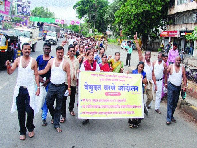 नाशिकरोड : महाराष्ट्र राज्य विनाअनुदानित शाळा कृती समितीच्या वतीने आपल्या विविध मागण्यांसाठी विभागीय आयुक्त कार्यालयावर अर्धनग्न मोर्चा काढण्यात आला होता.अंशत: अनुदानित शाळांना १०० टक्के अनुदान मिळावे व अघोषित शाळा, तुकड्या व ज्युनियर कॉलेज यांना अनुदान पात्र घोषित करून २० टक्के अनुदान द्यावे आदी मागण्यासाठी विनाअनुदानित शाळा कृती समितीच्या वतीने गेल्या दि. ६ आॅगस्टपासून आंदोलन सुरू आहे. सोमवारी (दि. २६) दुपारी विनाअनुदानित शाळा कृती समितीच्या वतीने बिटको कॉलेजपासून विभागीय आयुक्त कार्यालय व शिक्षण उपसंचालक कार्यालयावर घोषणा देत अर्धनग्न मोर्चा काढण्यात आला होता. विभागीय उपायुक्त प्रतिभा संगमनेरे, शिक्षण उपसंचालक नितीन बच्छाव यांना निवेदन देण्यात आले. मोर्चात समितीचे राज्य सचिव गोरख कुळधर, विभागीय अध्यक्ष बाळासाहेब ढोबळे, कांतीलाल नेरे, जिल्हाध्यक्ष भरत भामरे, उदय तोरावने, राजाराम गायकवाड, मनोज वाकचौरे, निशा पाटील, मनीषा पवार, सविता देसले, सोनल पाटील आदी सहभागी होते.