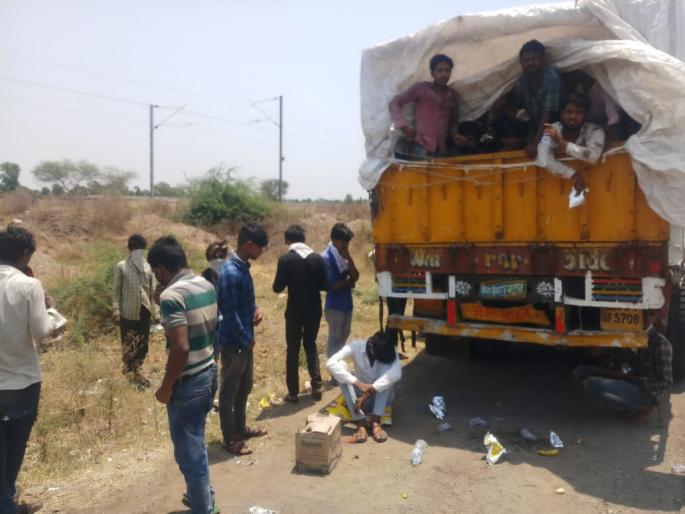लॉकडाउनमुळे जागोजागी अडकून पडलेल्या परप्रांतीय मजुरांना घराची ओढ लागली असून ते गटागटाने घराच्या दिशेने निघाले आहेत. असाच एक जत्था ट्रकने येत असताना तालुक्यातील पिंपळगाव जलाल टोलनाक्याजवळ नाकाबंदी सुरू असताना पोलिसांना आढळून आला. सेवाभावी संस्थेच्या वतीने पाणी व भोजनाची पाकिटे देऊन पोलिसांनी त्यांना माघारी पाठविले.