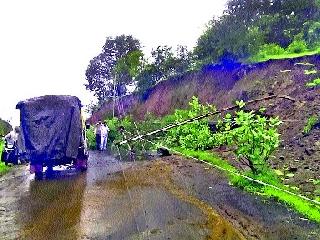 घोटी : इगतपुरी तालुक्यात रविवारीही सकाळपासून मुसळधार पाऊस कोसळत होता. या पावसामुळे दुपारी घोटी-वैतरणा रस्त्यावर कोरपगावजवळ एका वळणावर एक महाकाय वृक्ष वीजपुरवठा करणाऱ्या उच्च दाबाच्या तारेवर कोसळल्याने या रस्त्यावरील वाहतूक काही काळ ठप्प झाली. घोटीपासून वैतरणा-त्र्यंबकेश्वर ठिकाणी जाणारा हा एकमेव रस्ता असल्याने या रस्त्यावर वाहनांची मोठ्या प्रमाणात वर्दळ असते.याबाबत वृत्त असे की, इगतपुरी तालुक्यात मुसळधार पाऊस होत असून या पावसामुळे तालुक्यात मोठ्या प्रमाणात नुकसान होत आहे. आज दुपारच्या सुमारास घोटी वैतरणा मार्गावर नवीन रस्त्यावर कोरपगावजवळ वळणावर एक महाकाय वृक्ष वादळी वाऱ्यामुळे लगतच्या उच्च दाबाच्या विद्युत तारेवर कोसळला. यामुळे अनेक विजेचे पोलही कोसळले. दरम्यान श्रावण महिन्याच्या पहिल्या शनिवारीे त्र्यंबकेश्वरकडे जाणाऱ्या भाविकांचे रस्ता बंद झाल्याने हाल झाले. यामुळे विजेचे खांब या झाडांवर कोसळल्याने या भागातील अनेक भागातील वीजपुरवठा खंडित झाला आहे. (वार्ताहर)