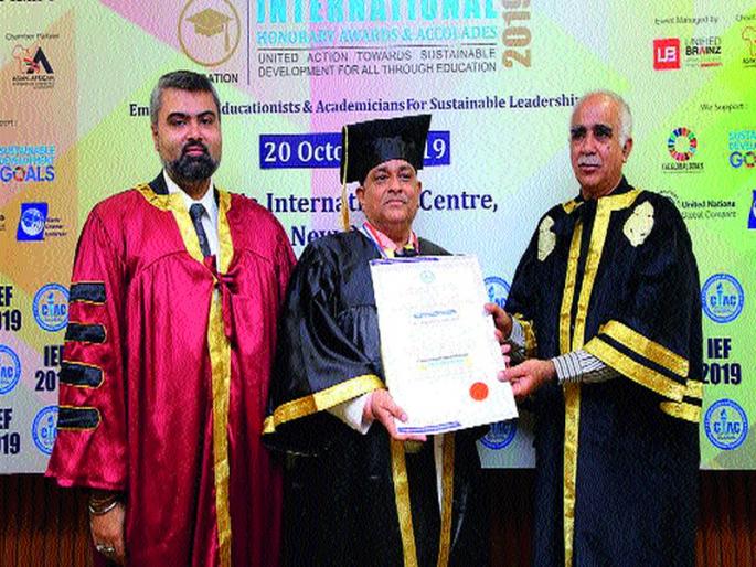 नाशिक : कॉन्फेडरेशन आॅफ इंटरनॅशनल अॅक्रिडेशन कमिशन (सीआयएसी) ग्लोबल, अॅझटेका विद्यापीठ, मेक्सिको यांच्या वतीने नवी दिल्ली येथे नुकत्याच पार पडलेल्या सातव्या ‘इंटरनॅशनल एज्युकेशन फोरम २०१९ ’ या दीक्षांत सोहळ्यात नाशिक येथील होमिओपॅथीक तज्ज्ञ डॉ. राजेंद्र साबद्रा यांना पीएच.डी. प्रदान करून सन्मानित करण्यात आले.यावेळी सीआयएसीचे प्रमुख डॉ. जी. डी. सिंग आणि राकेश कपूर आदी मान्यवर उपस्थित होते. यावेळी होमिओपॅथीमधील योगदानासाठी डॉ. साबद्रा यांना पीएच.डी. प्रदान करण्यात आली. यावेळी डॉ. साबद्रा यांनी होमिओपॅथी उपचारांकडे रुग्ण वळू लागले आहेत. रुग्णांचा होमिओपॅथीकडे वाढता ओघ पाहता भविष्यात होमिओपॅथी उपचारांना आणखी मागणी वाढेल, असे मनोगत त्यांनी व्यक्त केले. नाशिकमध्ये १९८४ पासून डॉ. साबद्रा कार्यरत आहेत. त्यांना डॉ. हाहनेमान जीवनगौरव पुरस्कार, नाशिक होमिओपॅथीक संघटनेकडून एक्सलन्स अवॉर्ड या पुरस्कारांनी सन्मानित करण्यात आले आहे.
