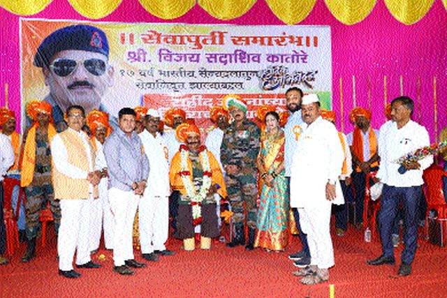वाडीव-हे : भारतीय लष्करात १७ वर्ष देशसेवा करून सेवानिवृत्त झालेल्या विजय कातोरे यांचा वाडीव-हे मित्र परीवाराच्यावतीने सेवापुर्ती सत्कार करण्यात आला. त्याचप्रमाणे महाराष्ट्रातील शहीद जवानांच्या कुटुंबियाचा तसेच उपस्थि जवानांचा सन्मान सोहळा आयोजित करण्यात आला होता.वाडीव-हे येथील विजय सदाशिव कातोरे हे जवान लष्कारात १७ वर्ष देशसेवा करून निवृत्त झाले. गावातील मिरवणुकीनंतर त्यांच्या सेवापूर्ती सोहळ्यानिमित्त देश सेवेत शहिद झालेले जवान तसेच पोलीस दलातील जवान आणि या कार्यक्रमास उपस्थित असलेले महाराष्ट्रातील जवानांचा सन्मान करण्यात आला.कार्यक्रमाला आमदार हिरामण खोसकर, गोरख बोडके, नगरसेवक विक्रम नागरे, विलास शिंदे, तुकाराम मोराडे, योगेश शेवरे, नाशिकचे माजी सैनिक संघटना अध्यक्ष फुलचंद पाटील, इगतपुरी तालुका माजी सैनिक संघटना अध्यक्ष पाटेकर, रामदास धांडे, गोकुळ घोलप, विष्णु वारूगसे, वाडीव-हे सरपंच रोहीदास कातोरे, ऊपसरपंच प्रविण मालुंजकर,डॉ.प्रशांत मूर्तडक, सर्व ग्रामपंचायत सदस्य व ग्रामस्थ मोठ्या संख्येने उपस्थित होते.यावेळी देशासाठी हौतात्म्य पत्करलेल्या जवानांच्या कुटुंबियांचा सन्मान करण्यात आला. शहीद जवान एकनाथ खैरनार, शहीद आण्णासाहेब झनकर, शहीद निवृत्ती ढोन्नर, शहिद संदीप ठोक, शहिद केशव गोसावी यांचा तसेच अशोक कातोरे, पोलिस हवादार पहिलवान दिलावर शेख यांंच्या कुटुंबियाचा सन्मानचिन्ह, शाल देवून सत्कार करण्यात आला. यावेळी निलेश जाधव, रविन्द्र राजोळे, आब्दुल इमानदार, संतोष टकले, सोमनाथ वडने, नितीन कुहीले, अमोल महाले, संदिप काळे, अशोक सुडके, अनिल जाधव यांंचाही सत्कार करण्यात आला. राष्ट्रध्वजाची आण-बान-शान राखण्यासाठी भारतमातेच्या रक्षणासाठी बलिदान दिलेल्या शहीद जवानाच्या कुटुंंबांचा सार्वजनिक ठिकाणी वावरताना योग्यतो सन्मान ठेवावा असे कारगिल युद्धात ॲापरेशन रक्षकमध्ये कामगिरी करतांना एक हात व दोन्ही पाय गमावलेल्या निवृत्त मेजर दिपचंद यांनी सांगितले. कार्यक्रमाचे सुत्रसंचलन लोकेश कटारीया यांनी केले.(०८ वाडीवऱ्हे १, २)१)२) वाडीव-हे चे सुपुत्र विजय कातोरे यांच्या सेवापुर्ती निमित्त शहीद जवानांच्या कुटुंबियाचा सन्मान व शहिद जवानांना मानवंदना देतांना लष्करी जवान व परीवार.