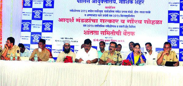 गणेशोत्सव, बकरी ईदच्या पार्श्वभूमीवर पोलीस आयुक्तालयातर्फे गंगापूर रोडवरील चोपडा लॉन्स येथे शांतता समिती तसेच गणेश मंडळांच्या पदाधिकारी तसेच कार्यकर्त्यांच्या बैठकीचे आयोजन करण्यात आले होते़ प्रास्ताविकात पोलीस उपायुक्त लक्ष्मीकांत पाटील यांनी गतवर्षी ध्वनिमर्यादेचे उल्लंघन करणाºया ३६ मंडळे, दखलपात्र एक व अदखलपात्र सहा जणांवर कारवाई करण्यात आली होती़ यंदा मंडळांनी याबाबत दक्षता घेण्याचे आवाहन केले़ तर पोलीस उपायुक्त विजयकुमार मगर यांनी गणेशोत्सवात दक्षतेबाबत माहिती दिली़