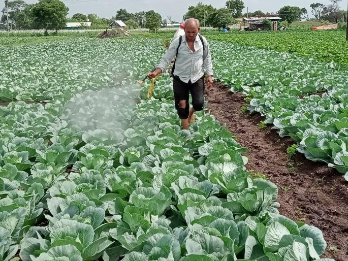 जळगाव नेऊर येथील कोबी पिकावरील औषधे फवारणी करताना शेतकरी.