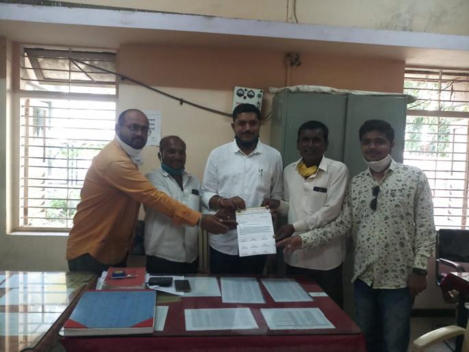 कळवण बाजार समितीचे जनसंपर्क अधिकारी अतुल पगार यांना निवेदन देतांना विलास रौदळ, मुन्ना पगार, तालुका संघटक राजेश्वर शिरसाठ, प्रल्हाद गुंजाळ, युवराज वाघ, विजय पाटील, मयूर पाटील.